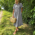 The Striped Lapel Button Down Shirt Dress is designed for the modern woman who cares about sophistication and style. The elegant long dress is perfect for any occasion.
