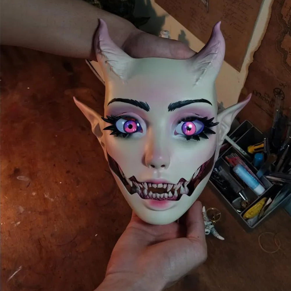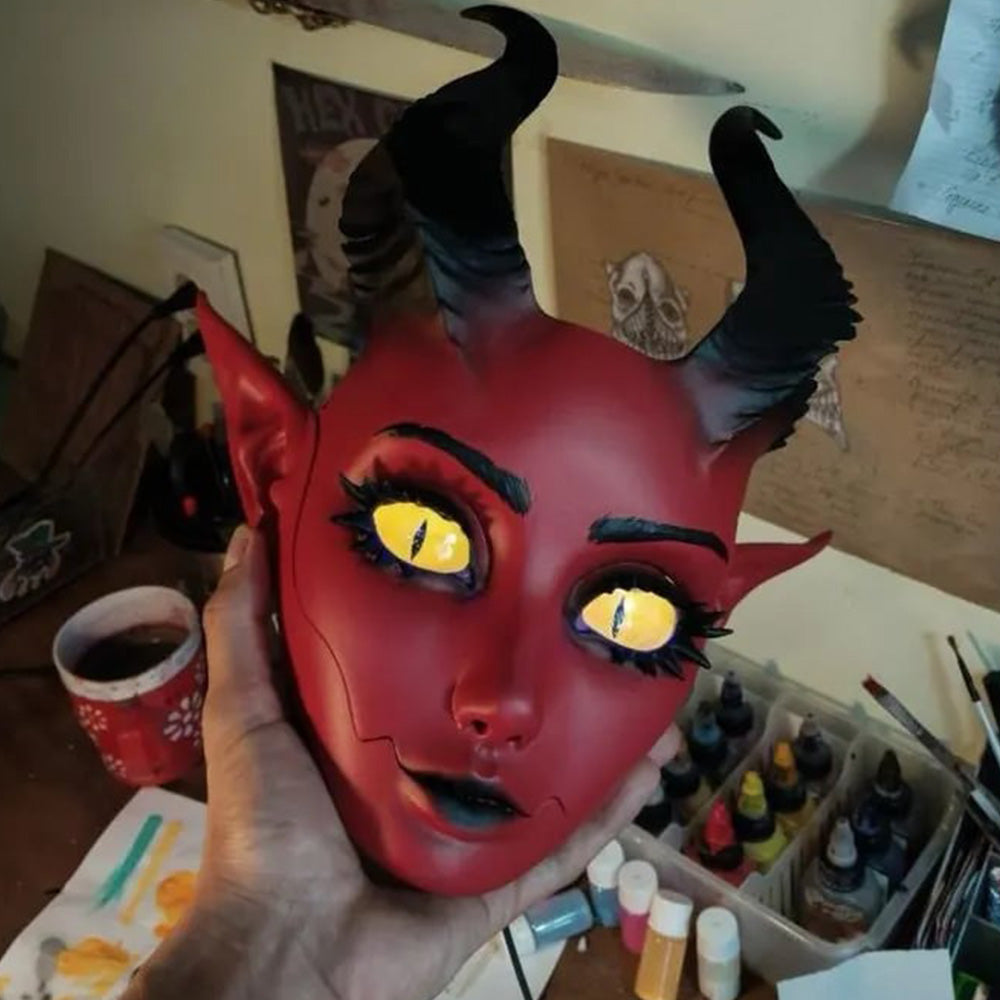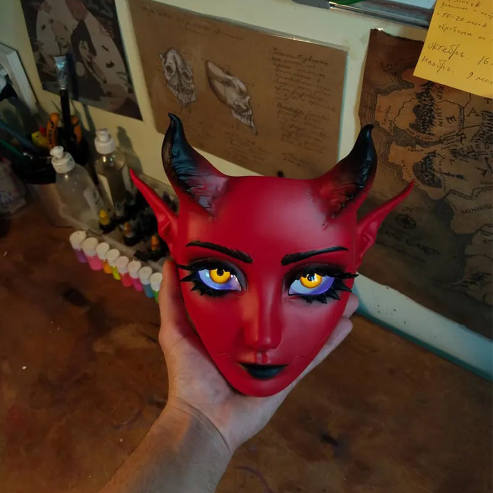 - Appearance Style: The mask features a rich demon theme, with a red main body complemented by black curved horns and pointed ears, creating a strong visual impact. It aligns well with fantasy and dark aesthetics, making it ideal for role-playing or artistic displays.