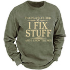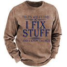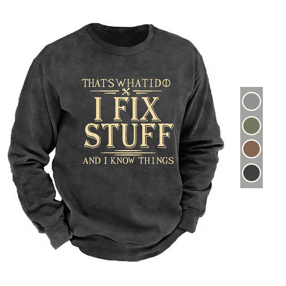 Design: This sweatshirt features a bold and witty slogan print that reads, “That’s What I Do – I Fix Stuff and I Know Things.” The typography is vintage-inspired with a touch of humor, perfect for DIY enthusiasts, mechanics, engineers, or anyone who takes pride in their hands-on skills. The front graphic includes small wrench icons that add a thematic, playful detail to the overall design. The relaxed fit and classic crew neck make it both stylish and comfortable for daily wear.