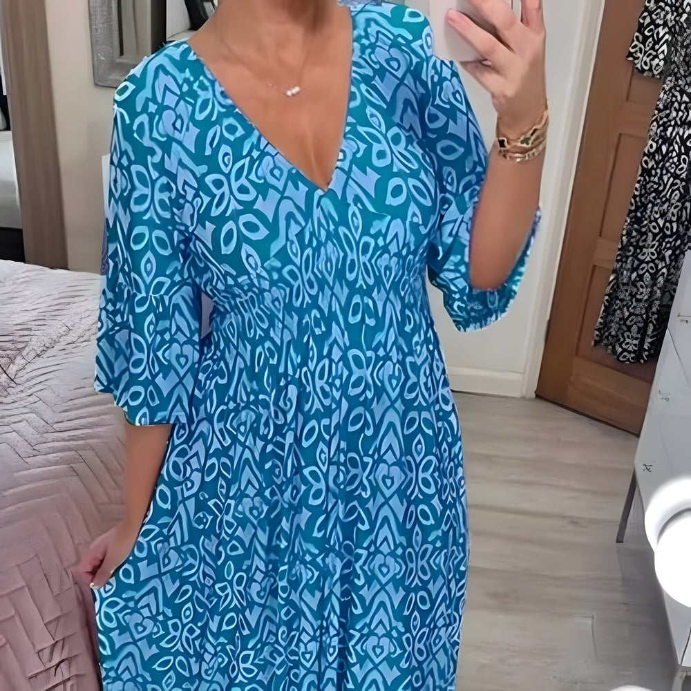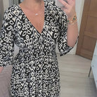 This dress is a v-neck, high waist, loose fitting design. This is a versatile dress that you can pair with a suit jacket, jacket, scarf or boots, and leggings to create a charming look.