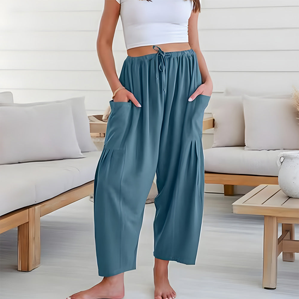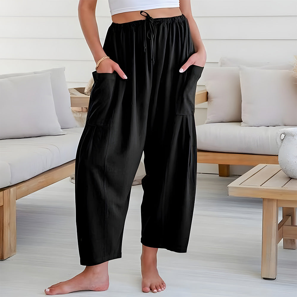 Wide-leg linen pants for everyday wear. Pair with any top, jacket, or footwear for versatile looks in any season. Features functional drawstring and side pockets.
