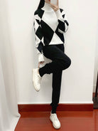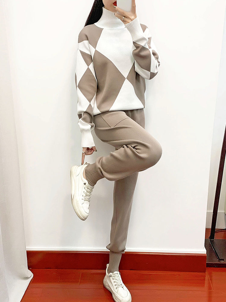 - 1 x Women's Plaid Long Sleeve Knitted Sweater and Ankle Length Harem Pant Suits