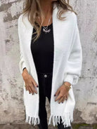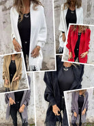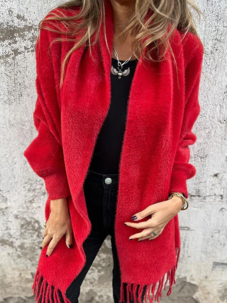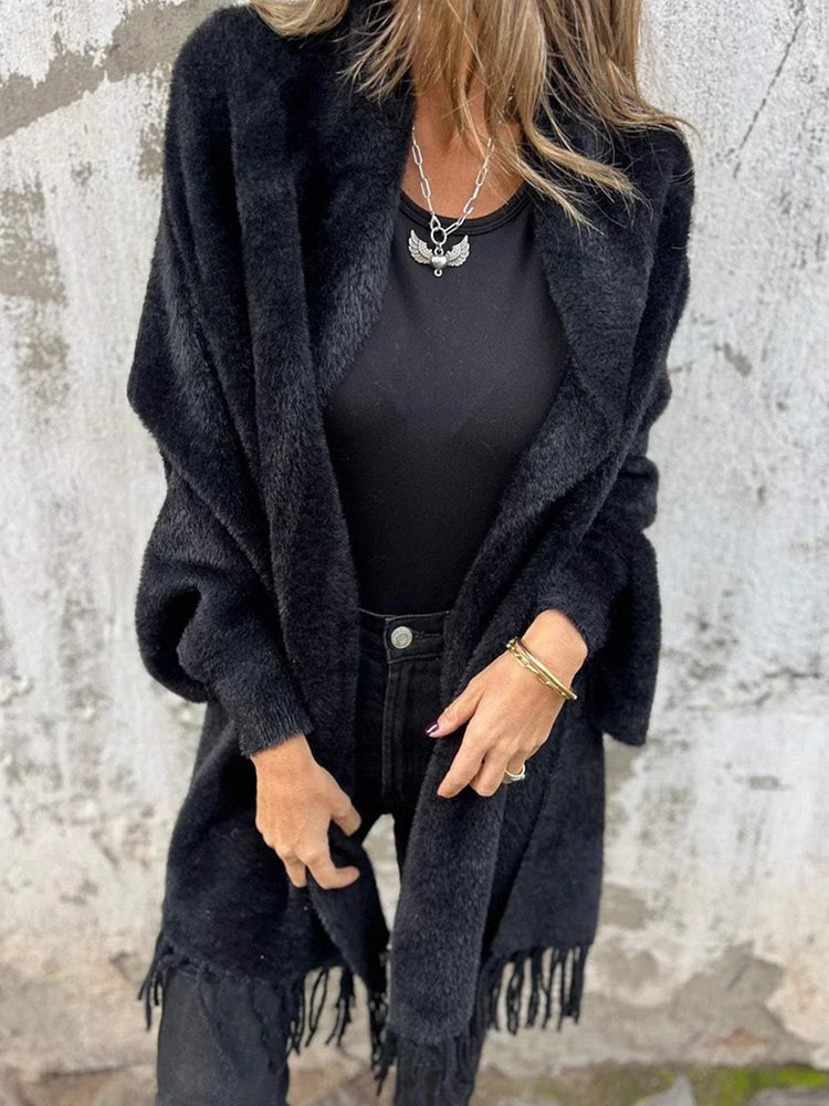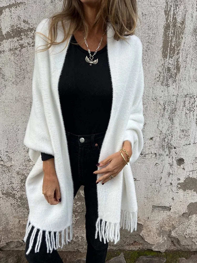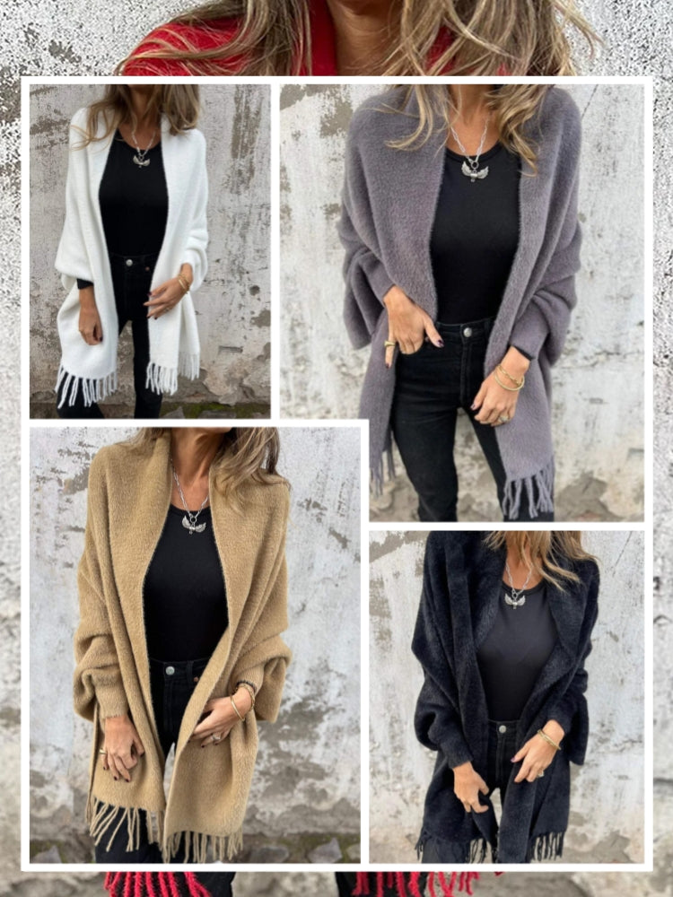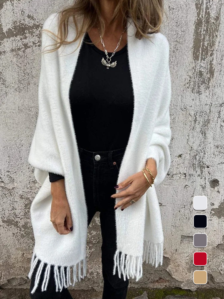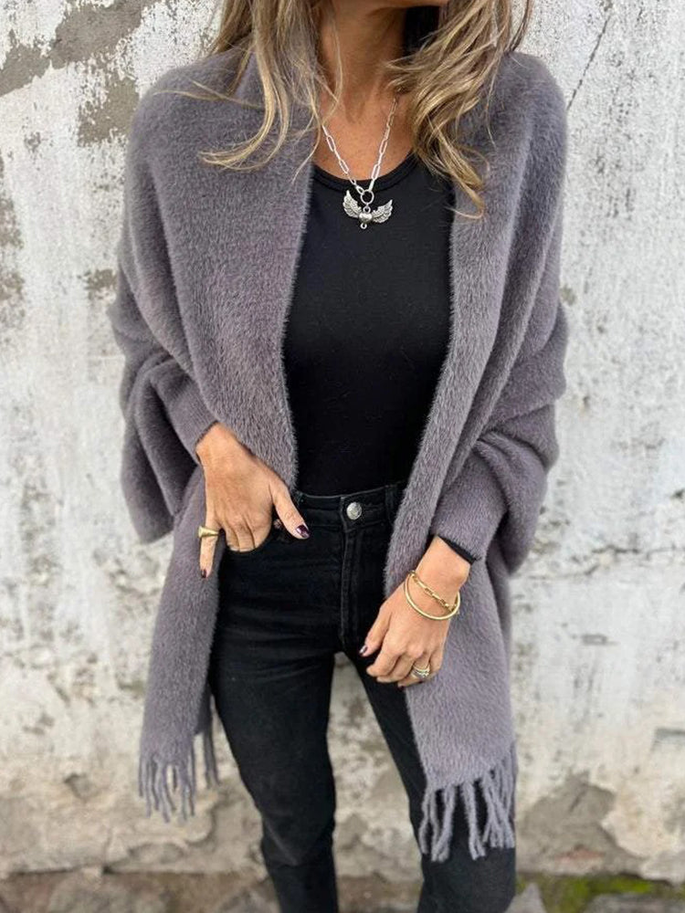 • 1 x Women's Warm Knit Plush Tassel Trim Relaxed Shawl Cardigan