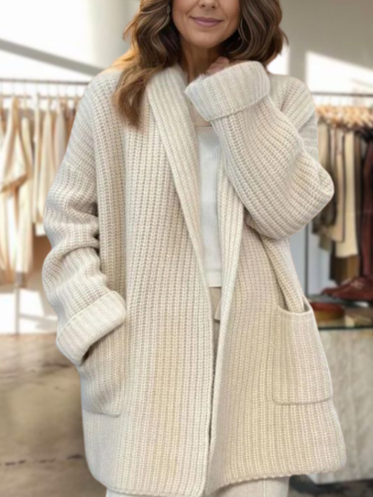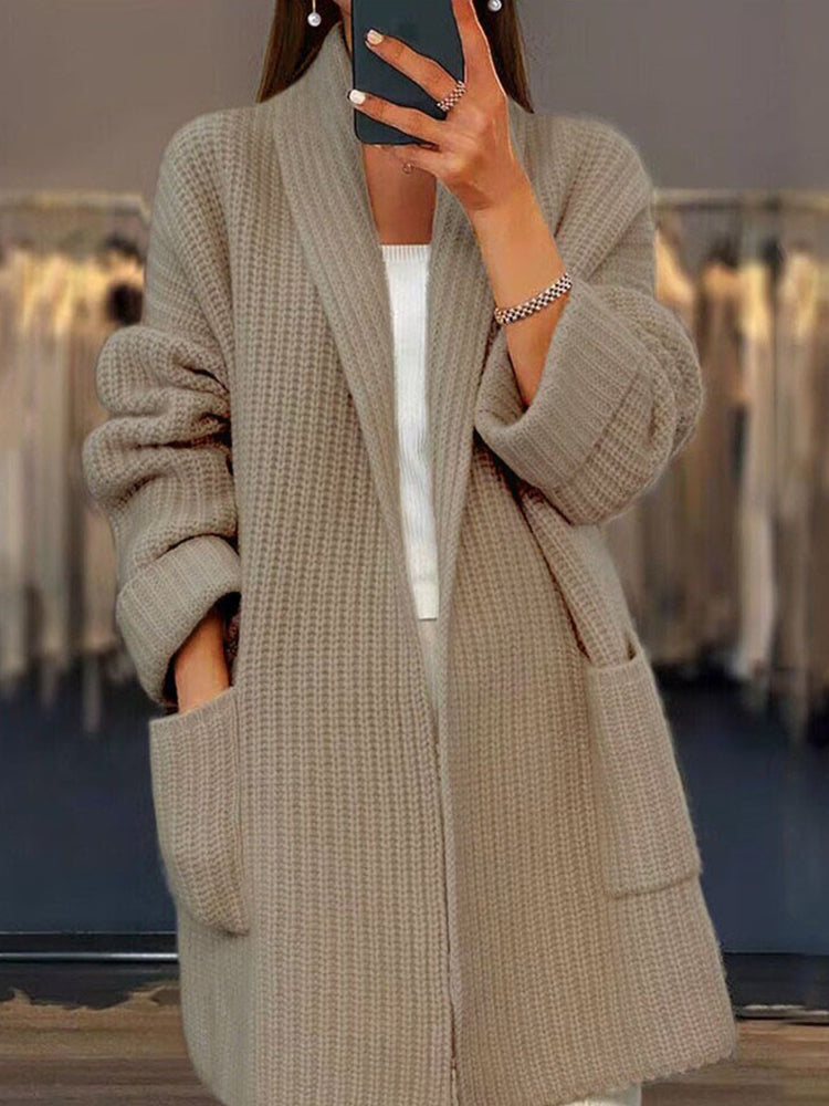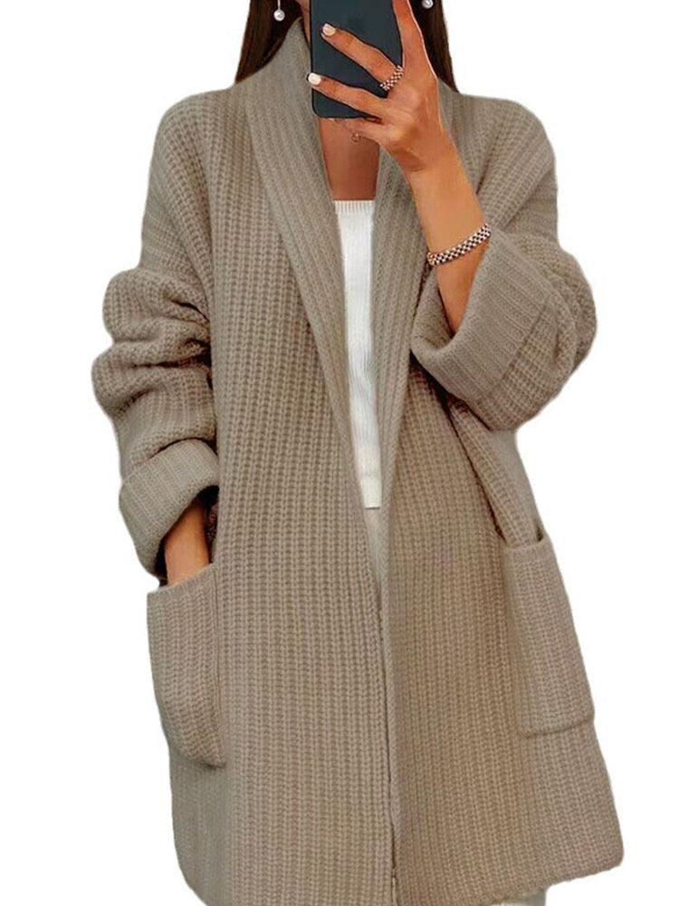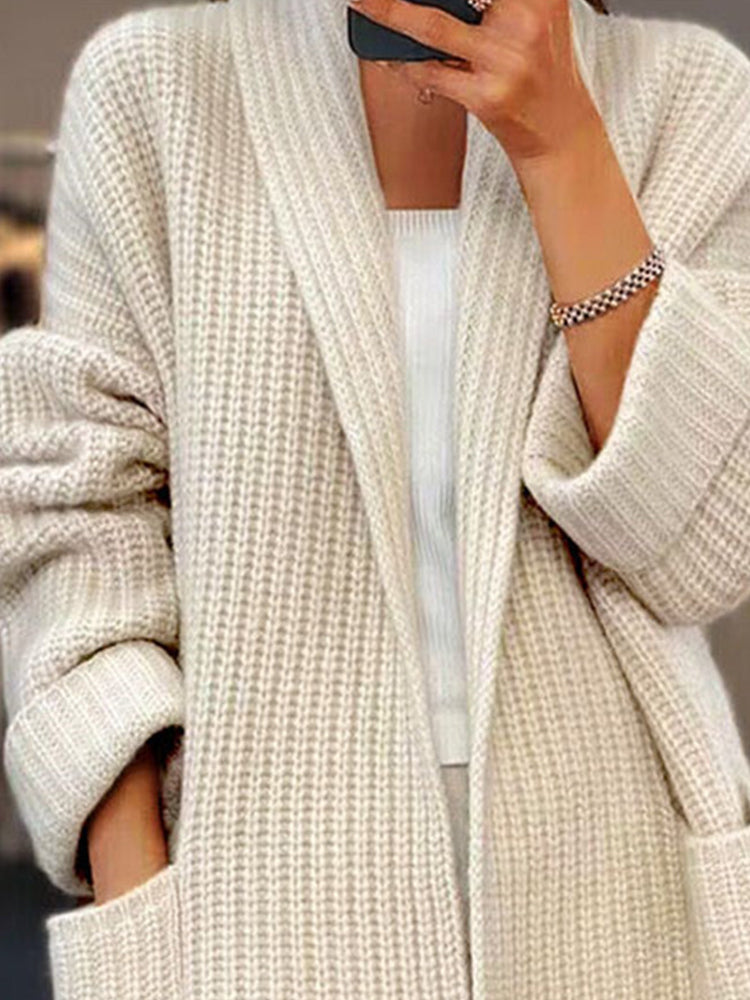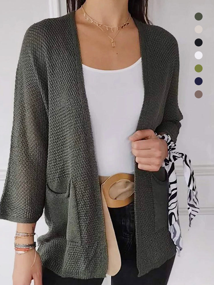 Women's Waffle Long Sleeve Solid Color Casual Knitted Cardigan with Pockets